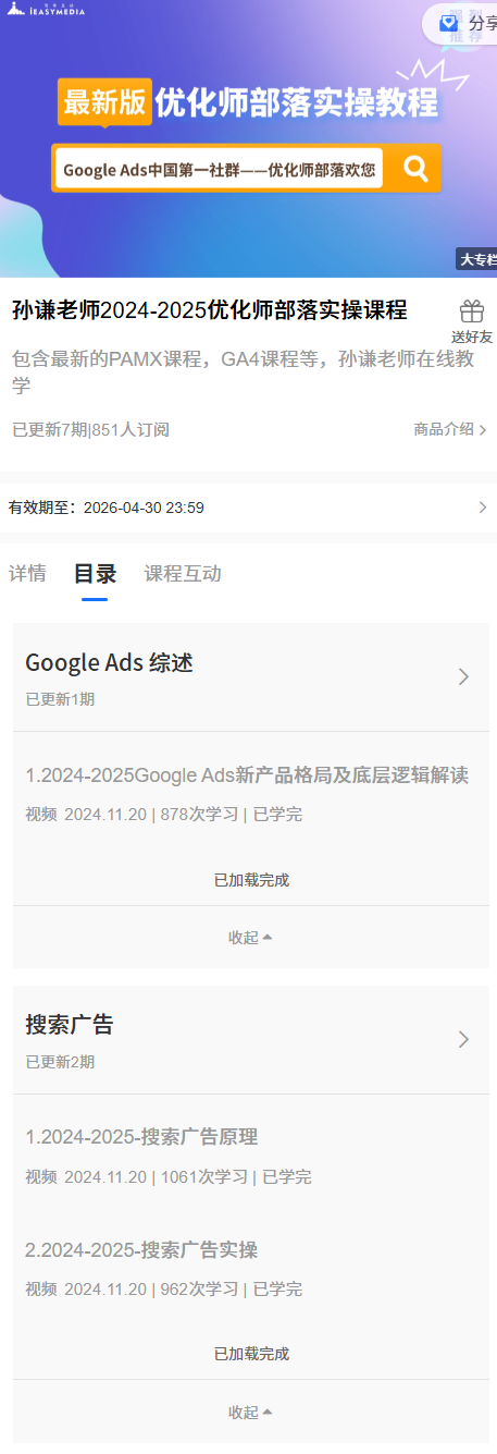 ===== 本全套课程来源于公司2022年自己报名《孙谦.谷歌优化师部落》,并2025年连续三年续费课程,持续更新中!!!=====